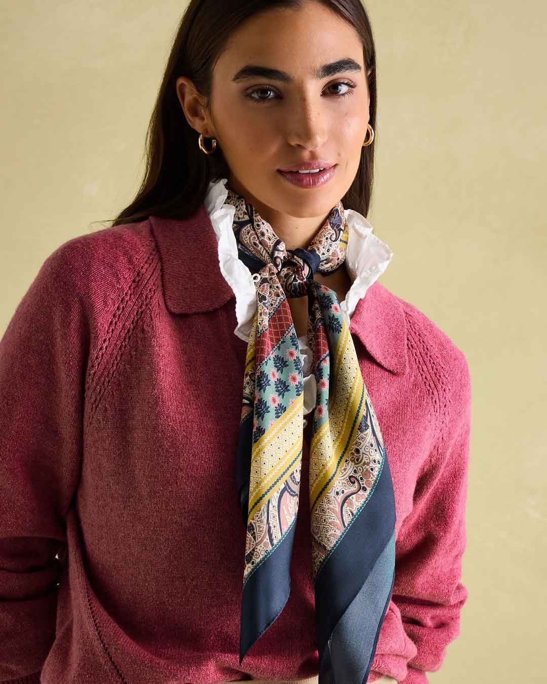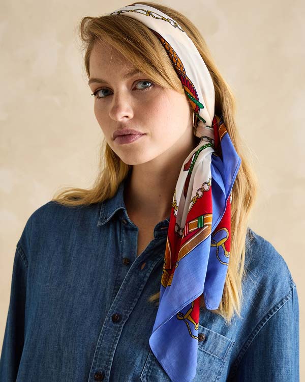 Smaller styles, like square scarves make for more of an understated look and are often more effective in the hair or worn as a neckerchief. An ever-versatile accessory, there are many different ways to wear your scarf. You can fold it into a triangle and tie it as a headscarf or wrap it around your neck as a neckerchief.