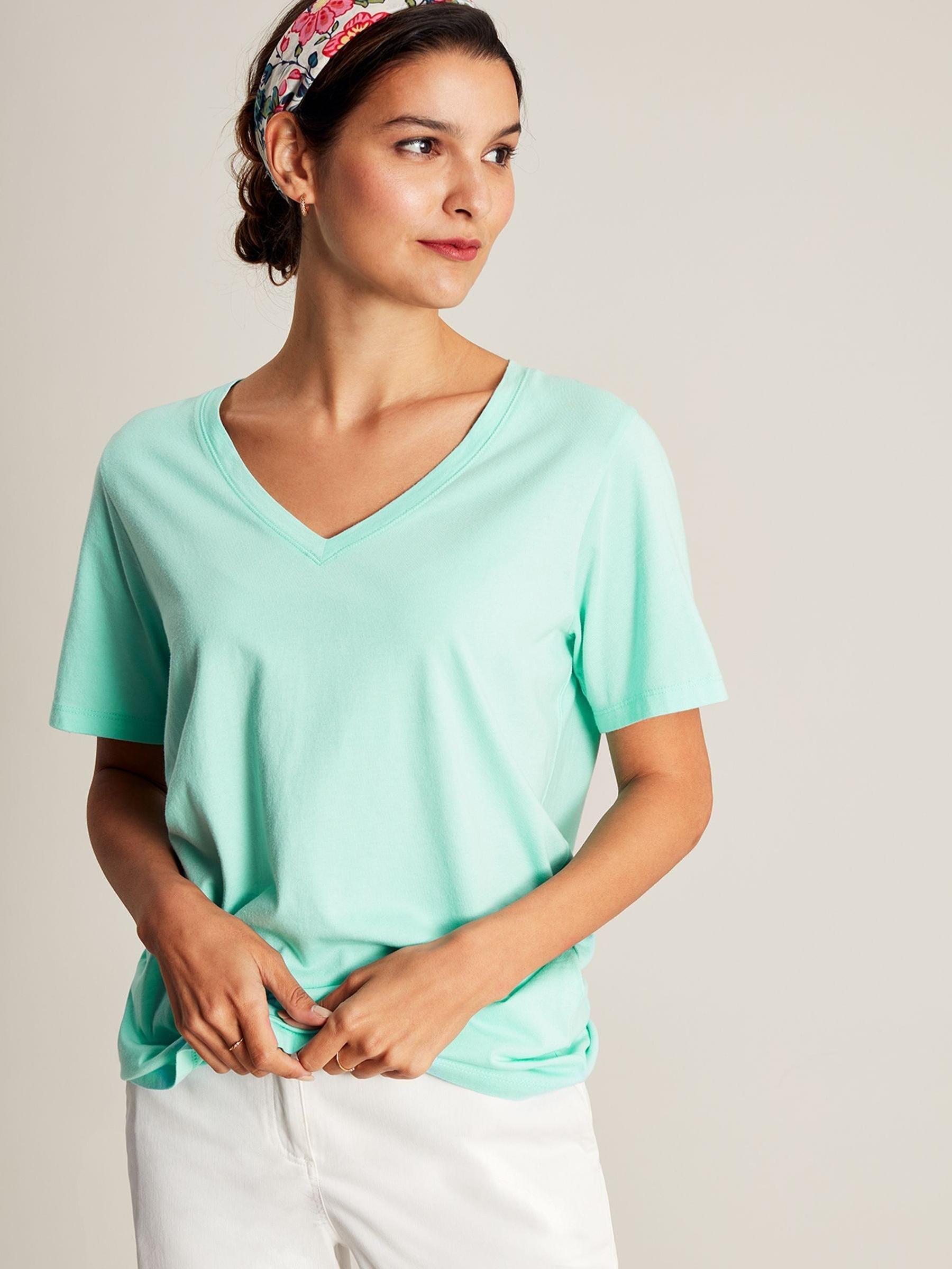 Our new Emily Jersey T-Shirt will fit into your everyday wardrobe seamlessly. It's short sleeves and flattering V-Neck makes it easy to layer up when needed. The dropped, curved hem keeps it looking great whether worn untucked or tucked in. It s finished with a tonal Joules embroidered hare to the hem.