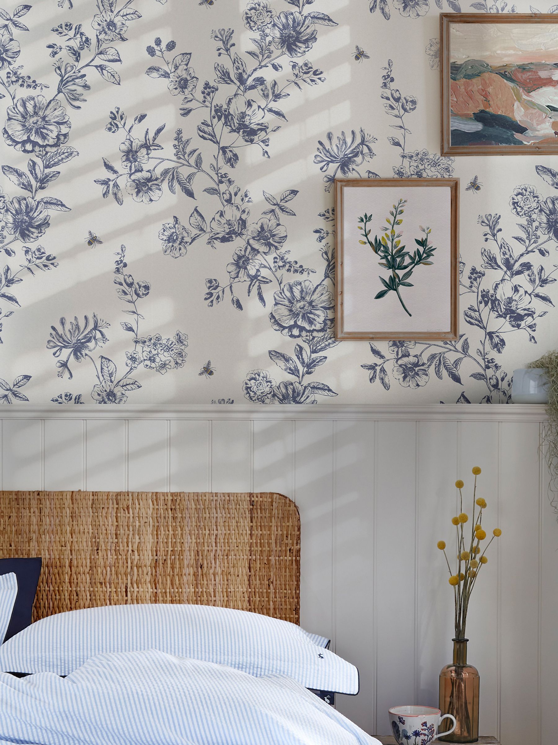 A timeless yet elegant pattern, this design will be the perfect addition to any home. With a soft crème backdrop and an array of delicately sketched flowers and busy bees.