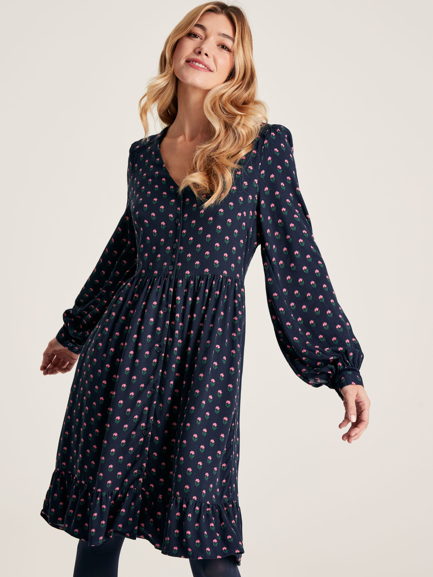 The Bonnie dress is proof that florals aren't just for spring. Featuring high-coverage blooms in a rich colour palette, it will elevate your autumn and winter wardrobe. It's crafted from a lightweight viscose that sits on the knee so can be styled with tights and leather boots.