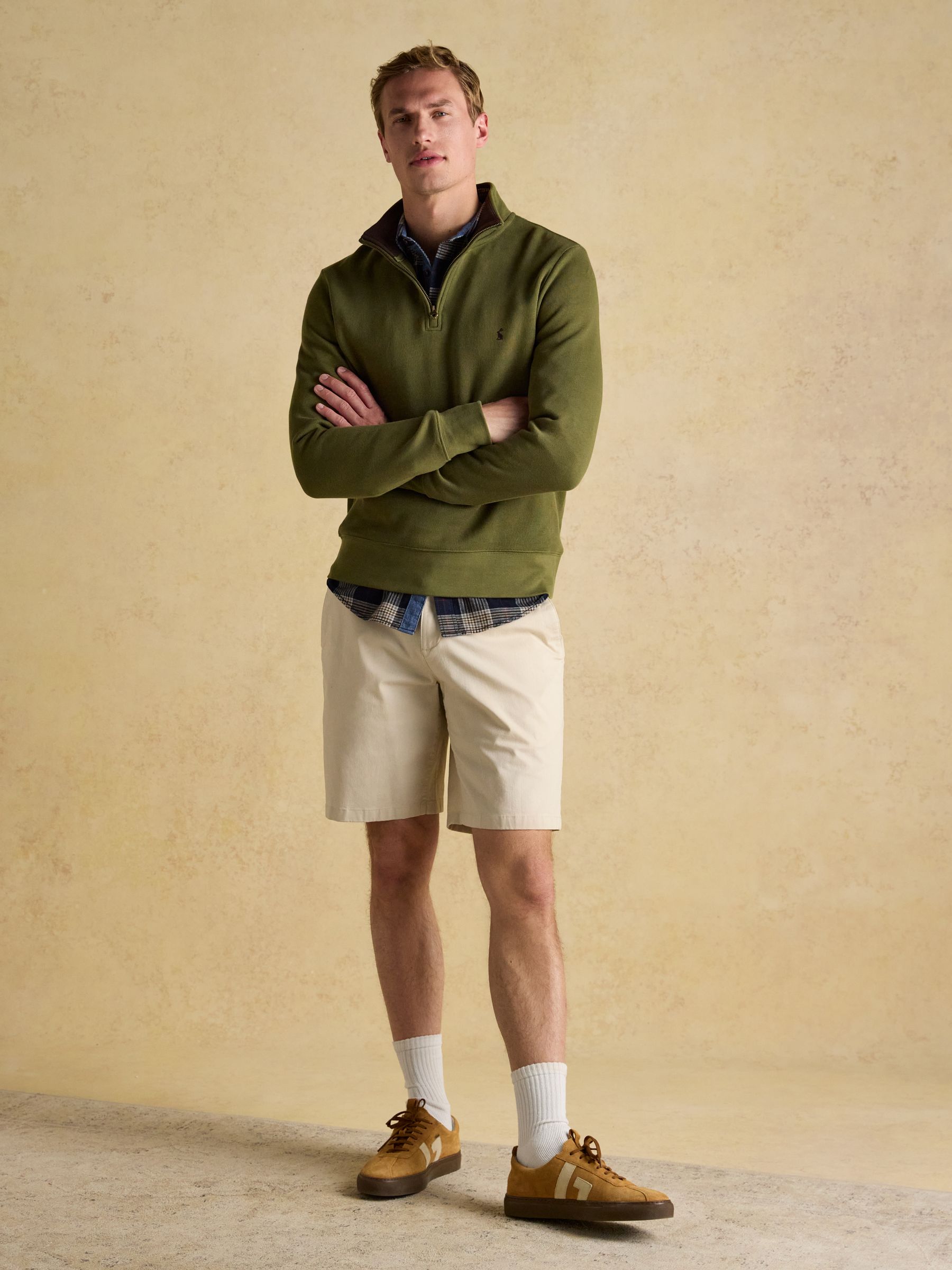 Refine your style with the Alistair khaki green sweatshirt. Carrying a clean, unfussy look and crafted from quality cotton, it's a staple that will live long in your life and wardrobe. The fine French ribbed fabric ensures a soft hand feel, a quarter zip fastening with metal zip offers a classic touch and a contrasting collar facing adds interest. As a mark of its quality, it's finished with our hallmark hare embroidered to the chest and Joules embroidery to the back of the neck, both in a subtle tonal colour. Style with chinos and crisp white trainers to achieve that smart/casual dress code. Cotton fabric French ribbed fabric for a soft hand feel Quarter zip fastening with metal pull Ribbed cuffs and hem Contrasting collar facing Tonal embroidered hare to the chest Tonal Joules embroidered to the back of the neck