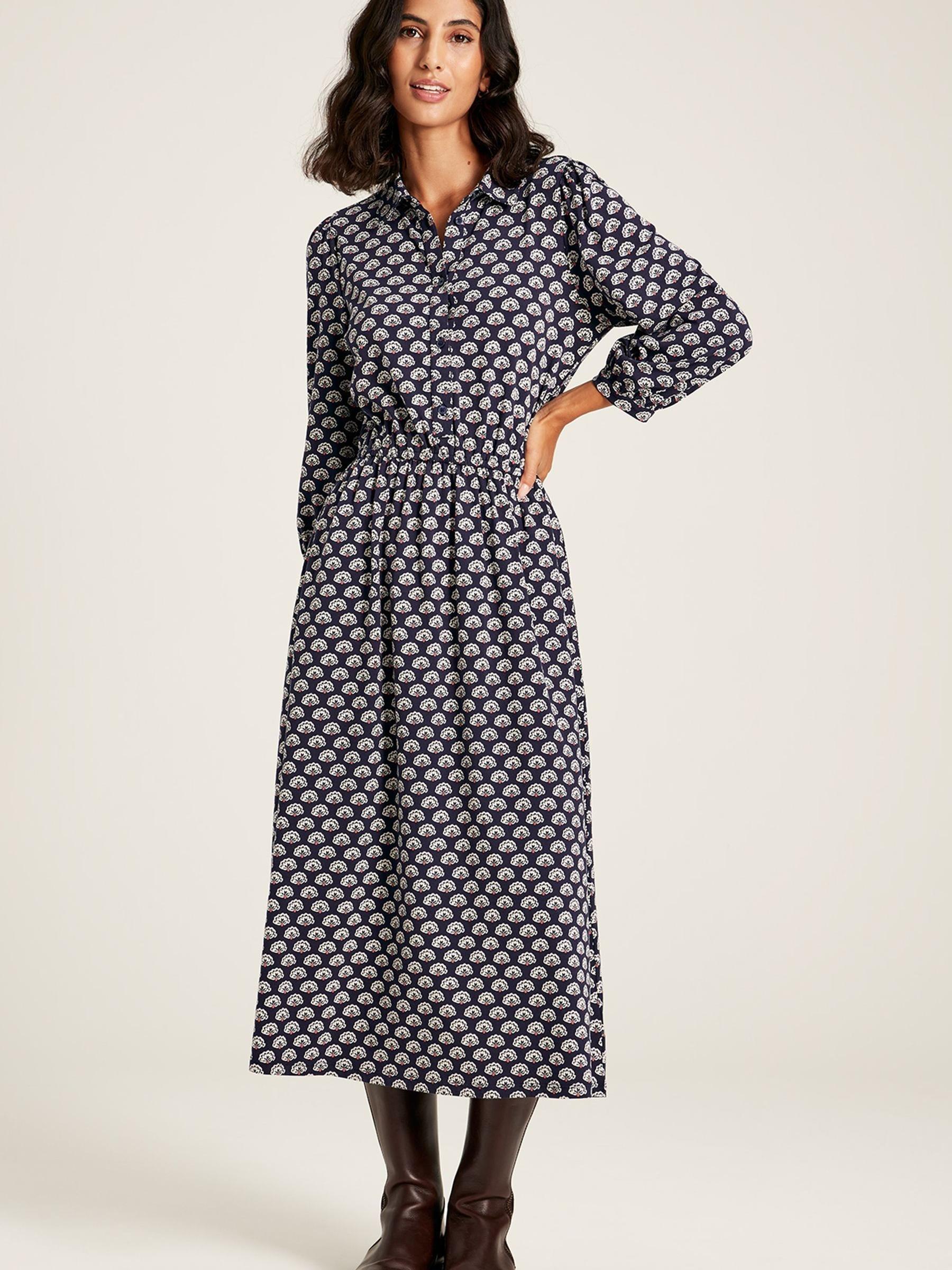This long-sleeve midaxi dress is so easy to wear, it won't spend much time on its hanger. Cut in a shirt dress style with a collar and button-down front, it has slight gathers to the top of the sleeves for added shape, as well as a flattering shirred waistline. As a handy extra detail, we've added two side pockets with colour pop stitching. The hand-drawn print that adorns it captures the colour palette of the season and will take you from day to night effortlessly. Jersey cotton Midaxi length Long sleeves with gathers at the shoulder Collar Button-down placket to the front Shirred waistline Side pockets with colour pop stitching Hand-drawn print Length: 125cm (based on a UK size 12)
