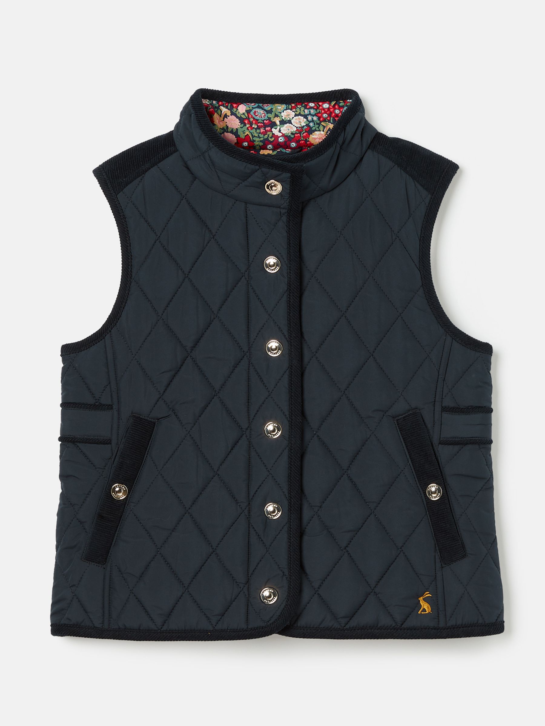 The Bridgefield gilet will bring out your little one's countryside. It features diamond quilting for a traditional look and has a showerproof fabric making it a rather handy layer while they're out playing. The popper fastening, corduroy trims and elasticated back panel mirror our women's styles and will have them feeling all grown up. Inside they'll discover a floral hand-drawn printed lining in a pretty colour palette they're sure to love. It's finished with side pockets with popper fastenings and a Joules embroidered hare to the hem. Classic fit Showerproof Diamond quilting Metal popper fastening Corduroy trims Side pockets with popper fastenings Elasticated back panel with fixed poppers Hand-drawn printed lining Embroidered hare to the hem Matching jacket available