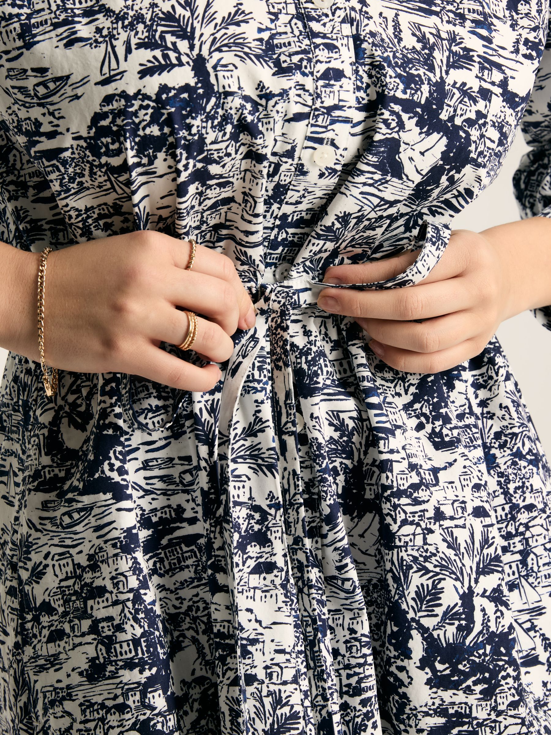 Cut in a classic shirt dress style, it has a stitched collar, button-down front and dropped sleeves ending in a deep buttoned cuff. It has a gathered drawcord waist for the most flattering fit. We've even added two side pockets (yes, a dress with pockets!).