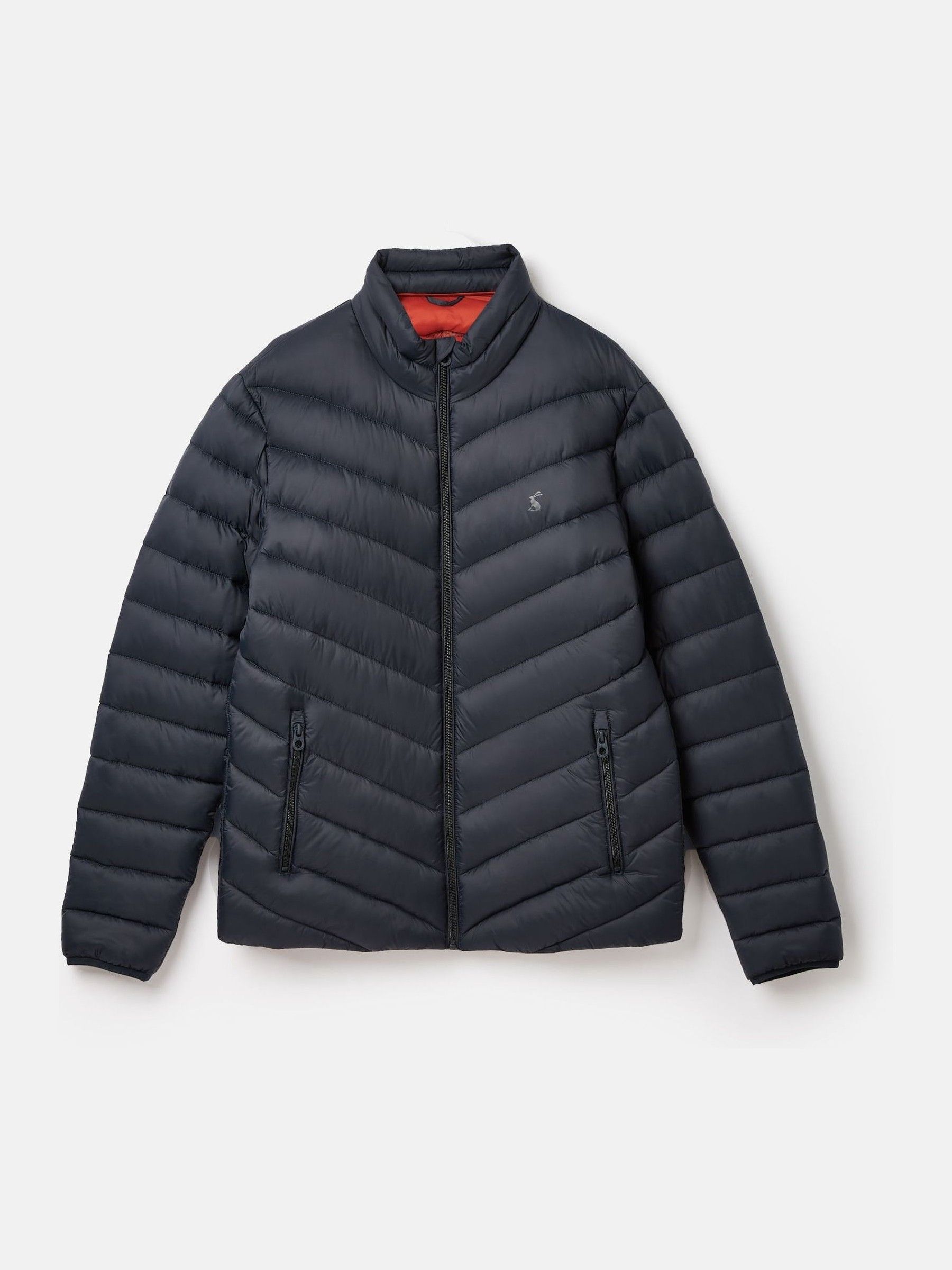 The Garrett navy jacket is an everyday style you can rely on all year round. The showerproof fabric is designed to fend off unexpected bursts of rain, while chevron quilting filled with wadding inside and out offers a layer of warmth. Functional details include a zip fastening, zipped side pockets and an additional internal pocket. It's finished with a Joules screen print hare to the chest - a mark of quality you can trust. Showerproof. Padded with wadding. Chevron quilting inside and out Zip fastening Zipped side pockets Internal pocket Elasticated cuffs with binding Joules screen print hare to the chest