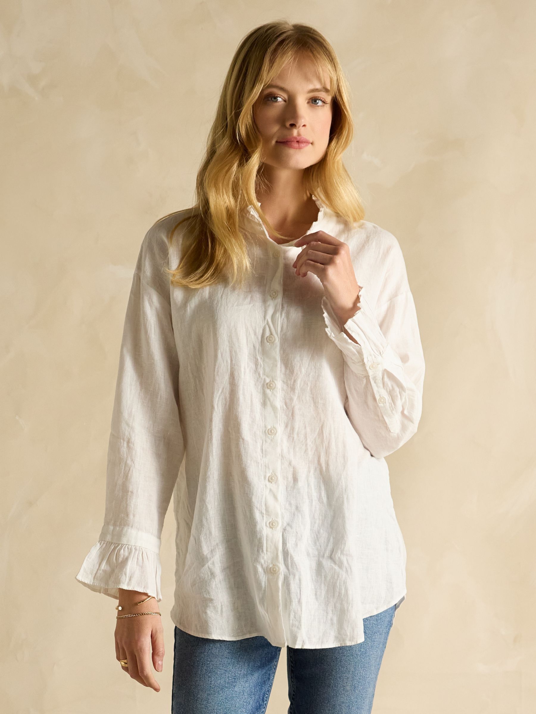 This shirt serves serious summer style. Made from 100% linen, it's a piece that will thrive in warm weather. The relaxed fit through the body and a long dropped curved hem that covers the bum, makes it versatile when it comes to styling - throw it over swimwear as a cover-up or with a pair of jeans for the everyday. It has dropped shoulders for a comfortable fit, a button down fastening and long sleeves with frill cuffs. A pie crust frill neckline makes a statement and will look elegant when layered over a knitted vest when the summer comes to a reluctant end. 100% linen Relaxed fit Dropped shoulders Long sleeves with frilled and button cuffs Dropped curved hem Button down fastening Pie crust neck