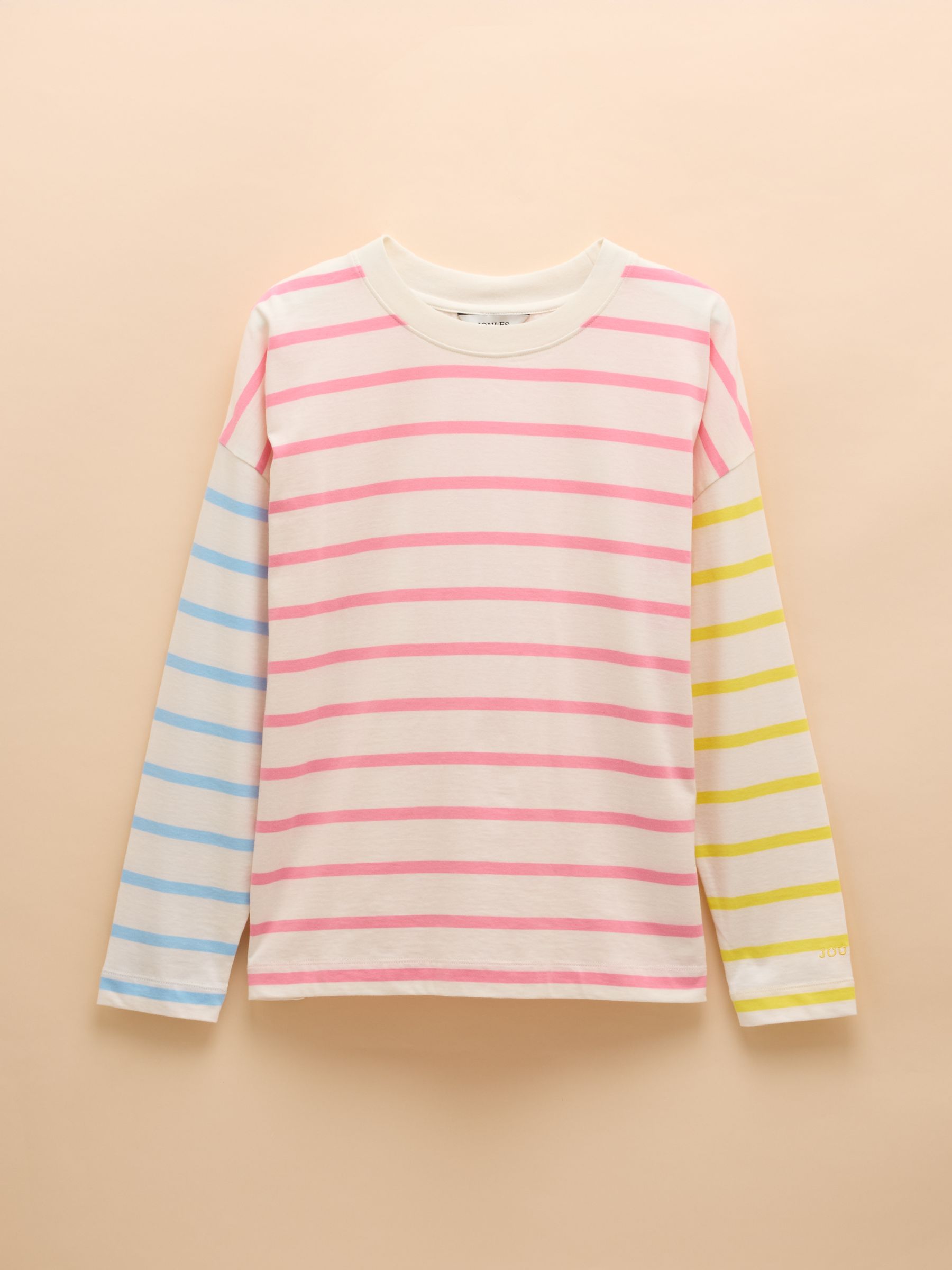 The Ellie top is an easy-to-wear style that will integrate effortlessly into your everyday wardrobe. It's crafted from a soft cotton jersey, has long sleeves with dropped shoulders and has an overall relaxed fit - perfect for achieving a more laid-back look. The round neck makes it a great layering piece while the stripes are truly timeless. It's completed with a Joules badge to the left sleeve (as worn) for a branded touch. Cotton jersey Relaxed fit Dropped shoulders Round neck Striped Joules branded tab to the left sleeve (as worn) Items with the curve logo are available in sizes 18 and above.