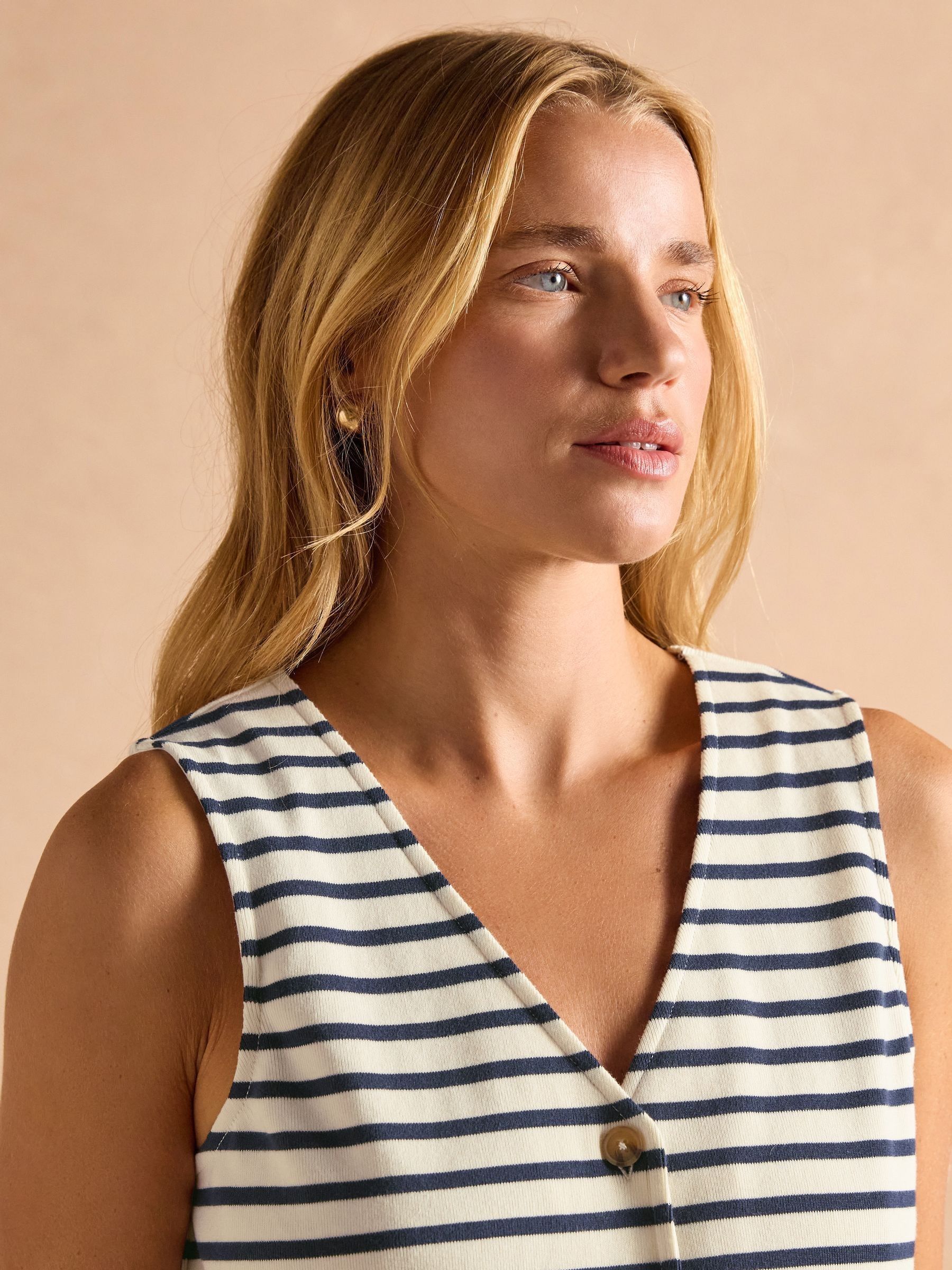A stylish new tank for the spring and summer months is calling you. It's crafted from the same 100% cotton jersey fabric you love, but has been elevated through its new design. The back neck has been lowered so that the tank can be worn with the buttons at the front, or as a statement to the back, giving you more ways to wear it. The inverted V at the hem creates a flattering silhouette, and the ribbed fabric finish adds comfortable stretch. Create the ultimate summer look by styling with a pair of wide-leg linen trousers or shorts. 100% cotton jersey Ribbed fabric finish for stretch Slim fit Button fastening Multi-wear design - buttons to the front or back Inverted V hem