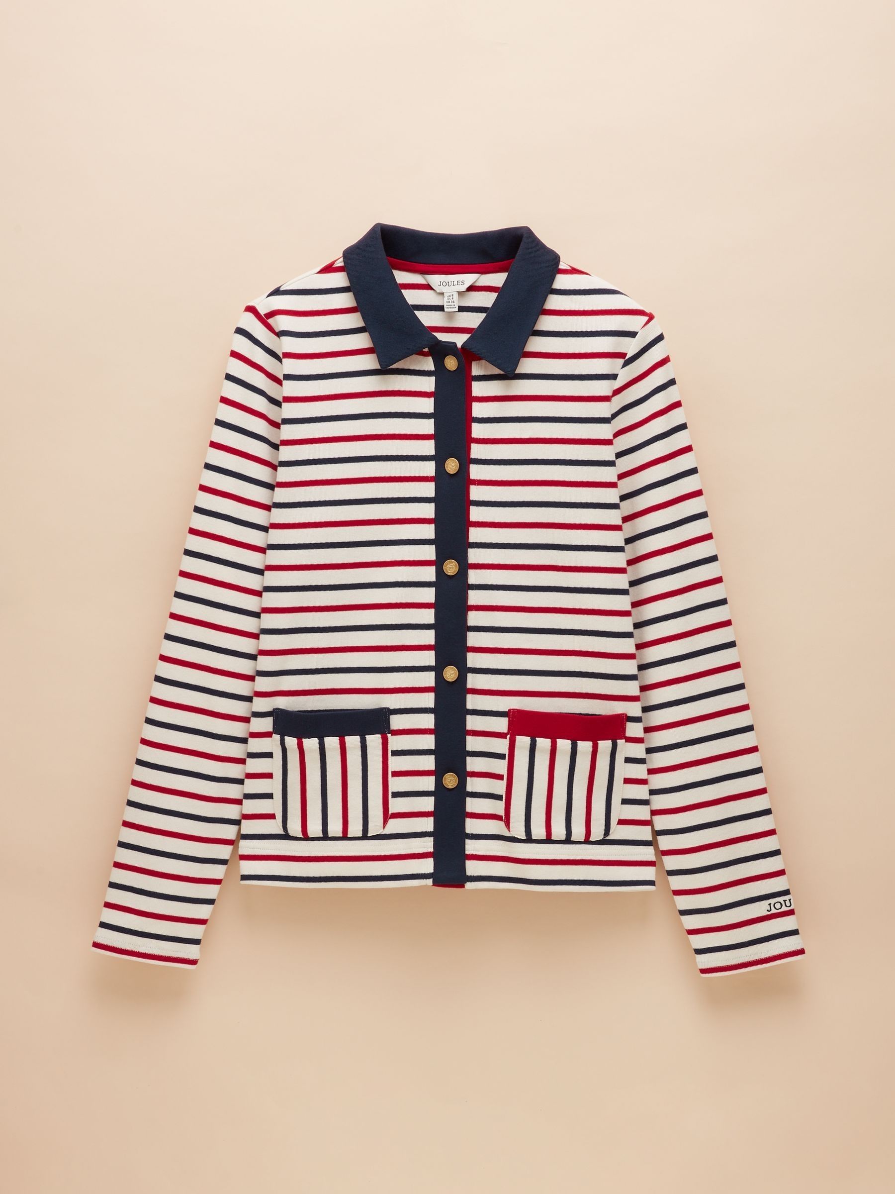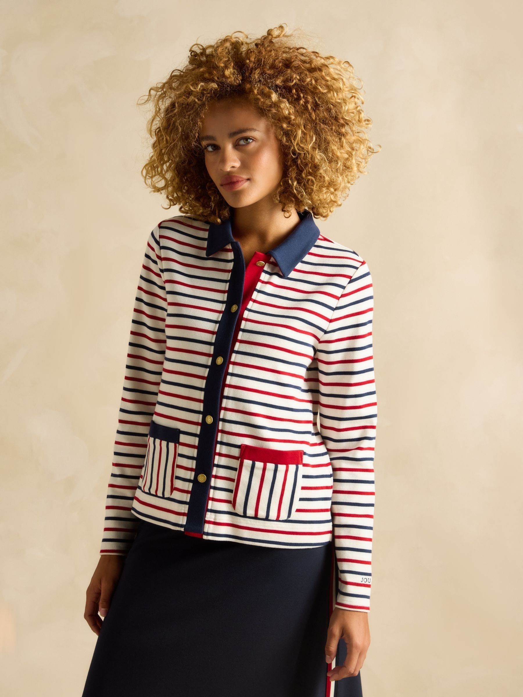 A cardigan you'll need to have. Crafted from Mariner's Grade 100% ribbed cotton jersey and with a comfortable stretch, it's a piece designed to elevate your wardrobe this season. It has a flattering boxy fit through the body, a collar, front patch pockets and premium gold buttons. Signature stripes add a timeless look and are perfect for wearing from season to season. For an easy yet elegant look, style with your favourite jeans. Mariner's Grade 100% ribbed cotton jersey Premium gold button fastenings Signature stripes for a timeless look Two pockets to the front Collar