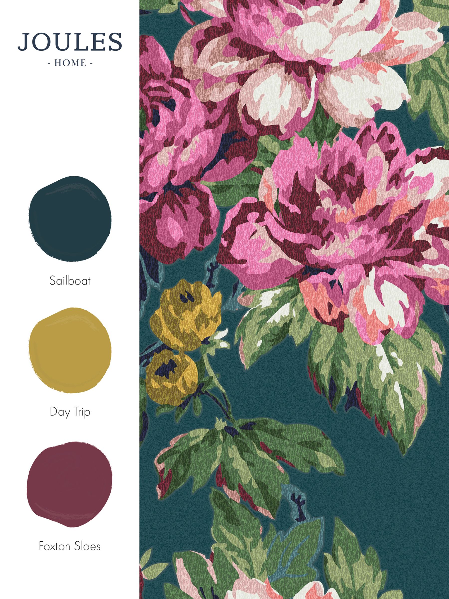 This blossoming large-scale floral wallpaper design features flowers in full bloom, trailing through the foliage in a stunning, rich colour palette of pinks and fuchsia on a luxurious teal background that’s finished with a textural effect.